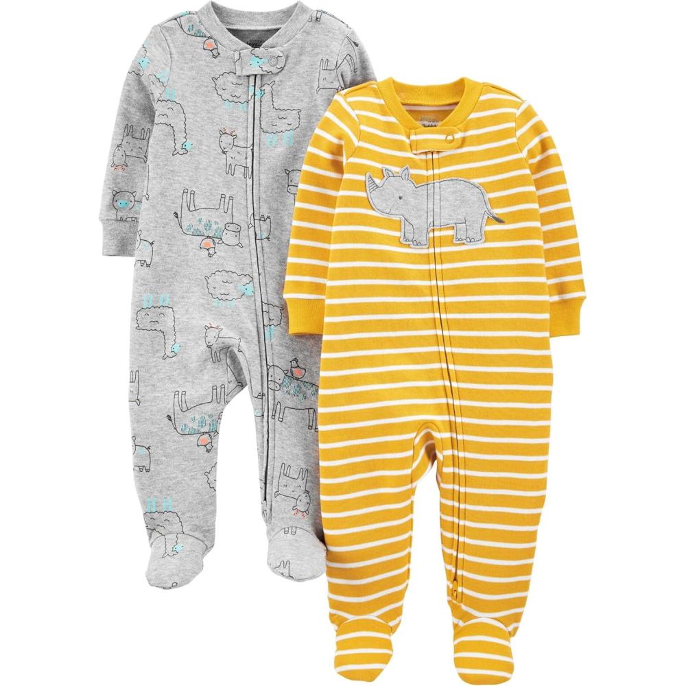 Simple Joys by Carter’s baby-boys 2-way Zip Thermal Footed Sleep and Play, Pack of 2(Grey Cow/Yellow Hippo)