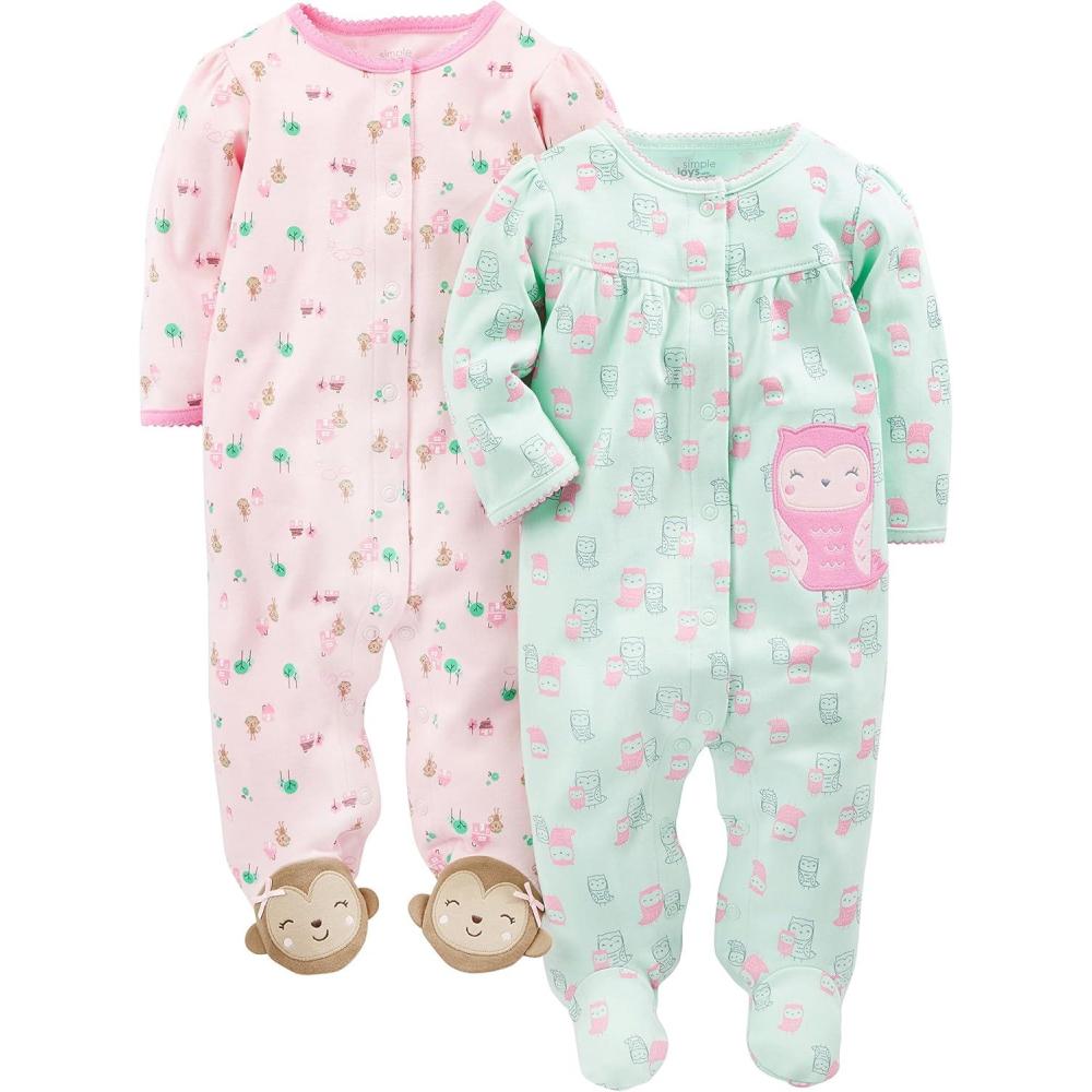 Simple Joys by Carter’s baby-girls 2-pack Cotton Snap Footed Sleep and Play(Mint Green Owls/Pink Monkey)