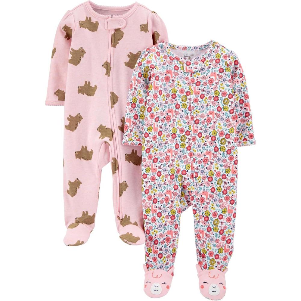 Simple Joys by Carter’s Baby Girls’ Cotton Footed Sleep and Play, Pack of 2(Pink Bear/White Floral)